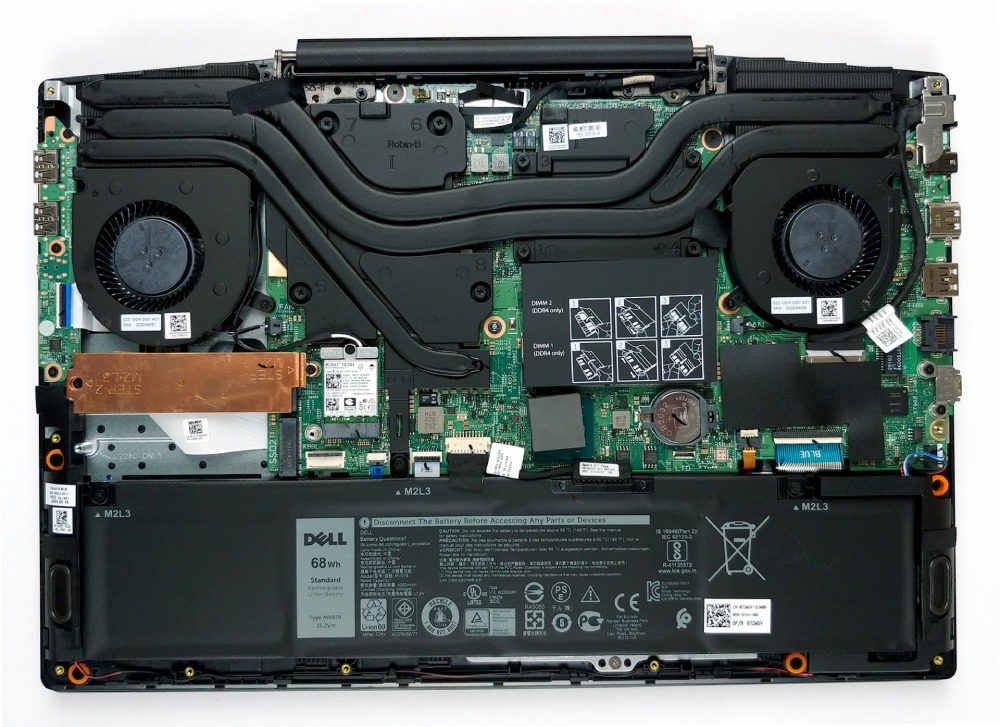 Система охлаждения Dell состоит из вентилятора и радиатора. Тепло, которое вырабатывают греющиеся детали ноутбука, скапливается на радиаторе. Вентилятор, обдувая детали, направляет горячий воздух в отверстия для вентиляции. Если угрозы перегрева нет, вентилятор охлаждения Dell просто выполняет циркуляцию воздуха. Температуру внутри устройства контролируют термодатчики. Если они фиксируют превышение температуры больше нормы, вентиляторы начинают работать интенсивней.